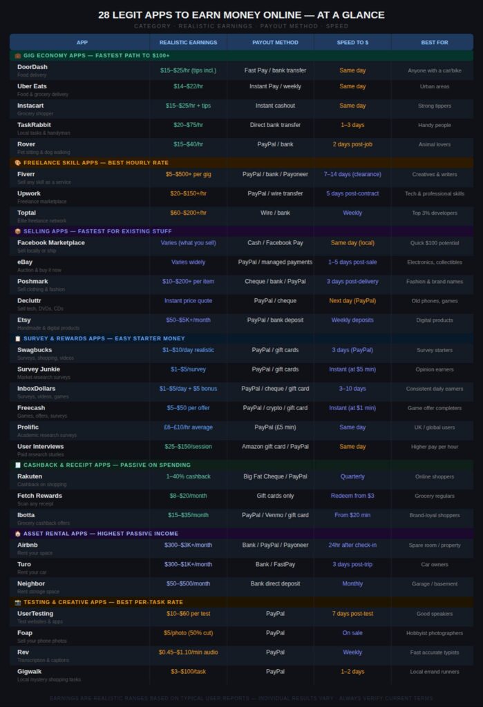 Infographic: All 28 apps — realistic earnings, payout methods, speed, and who they’re best for