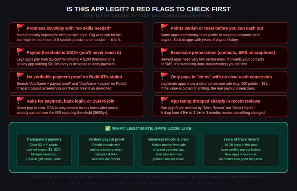 The most reliable test I use: search the app name on Reddit, sort by “New”, and look for posts from the past 90 days. If you see recent payout screenshots, it’s probably real. If you see threads asking “has anyone actually gotten paid?”, move on.
