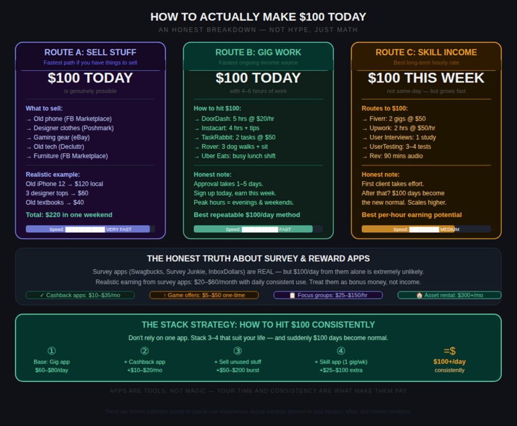 Yes — with gig apps (DoorDash, Instacart, TaskRabbit) and/or selling items on Facebook Marketplace or Decluttr. A 5-hour DoorDash or Instacart shift in a decent market can yield $75–$130 including tips. Selling an old phone or laptop locally can hit $100 in a single transaction. Survey and rewards apps alone cannot reliably generate $100 in a single day.