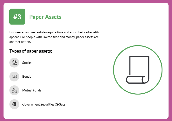 Businesses and real estate require time and effort before benefits appear. For people with limited time and money, paper assets are another option.